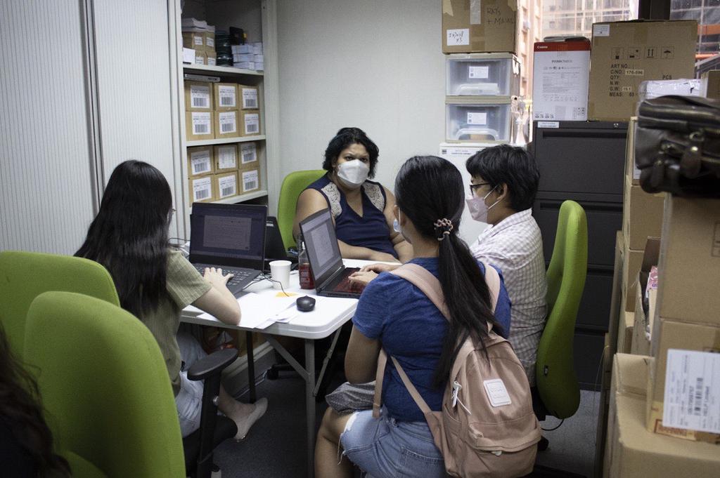 Manisha Wijesinghe, the director of HELP for Domestic Workers, an NGO that supports migrant domestic workers, sits with a caseworker to assist a domestic helper with her problems in Sheung Wan, Hong Kong.