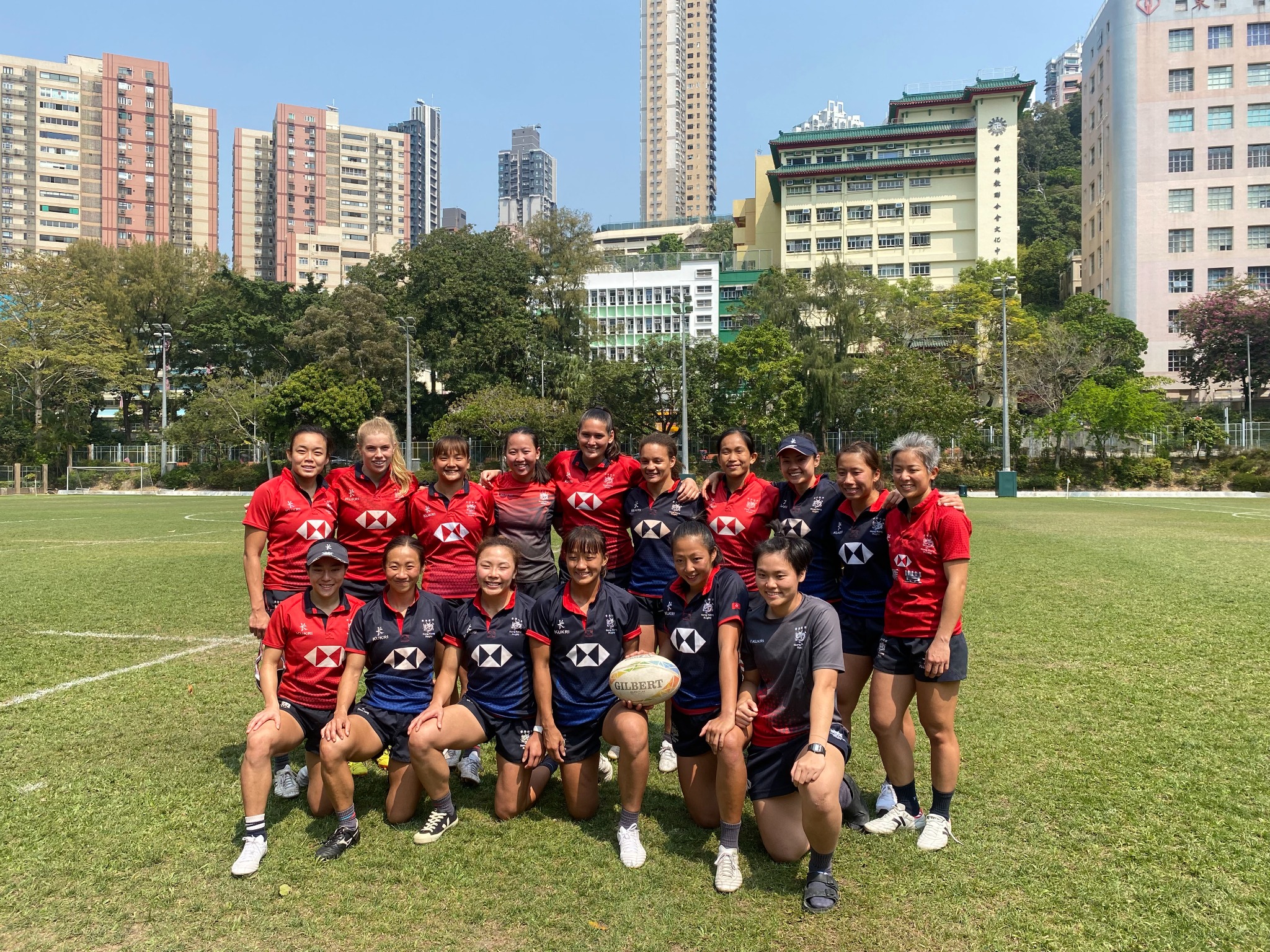 The women's Hong Kong rugby team pose for a photo after completing their training ahead of the HSBC/ Cathay Pacific Rugby Sevens Tournament in April 2023.